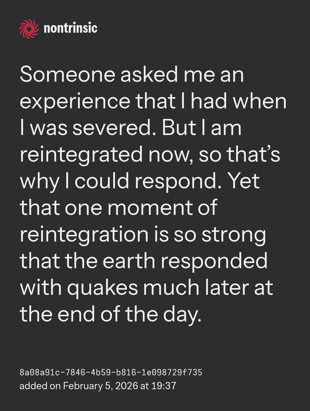 Someone asked me an experience that I had when I was severed. But I am reintegrated now, so that’s why I could respond. Yet that one moment of reintegration is so strong that the earth responded with quakes much later at the end of the day.