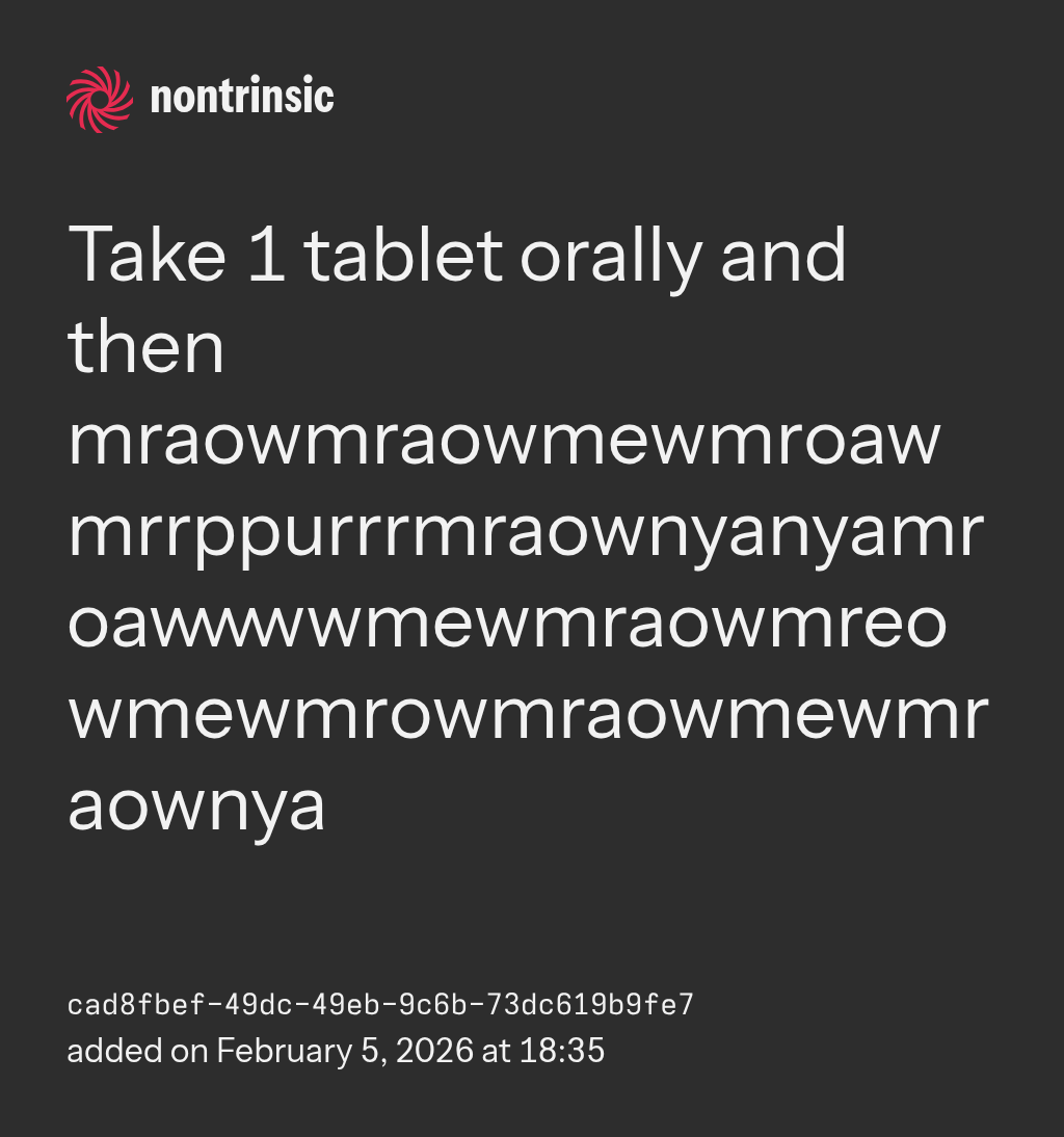 Take 1 tablet orally and then mraowmraowmewmroawmrrppurrrmraownyanyamroawwwwmewmraowmreowmewmrowmraowmewmraownya