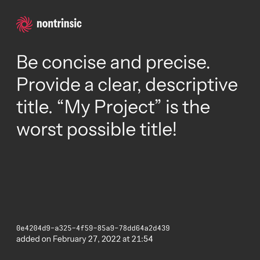teilenBe concise and precise. Provide a clear, descriptive title. “My Project” is the worst possible title!