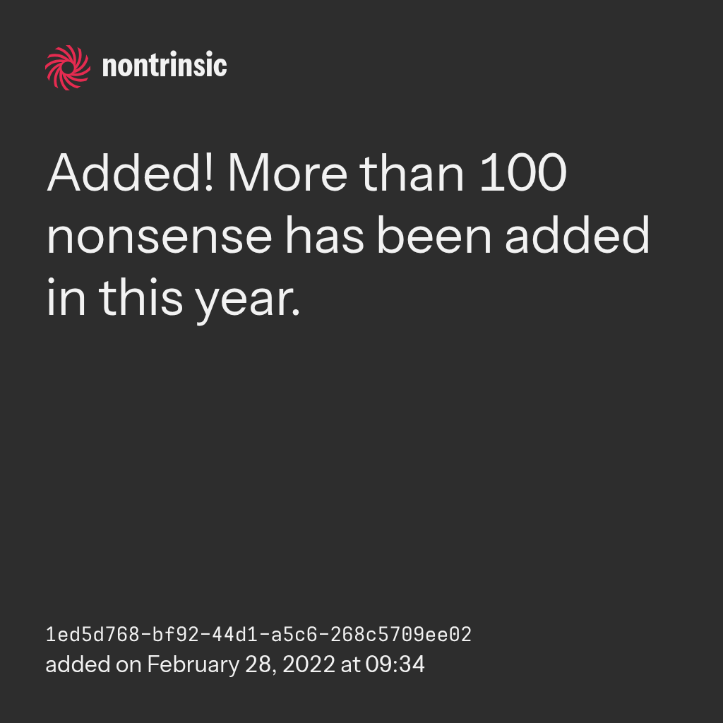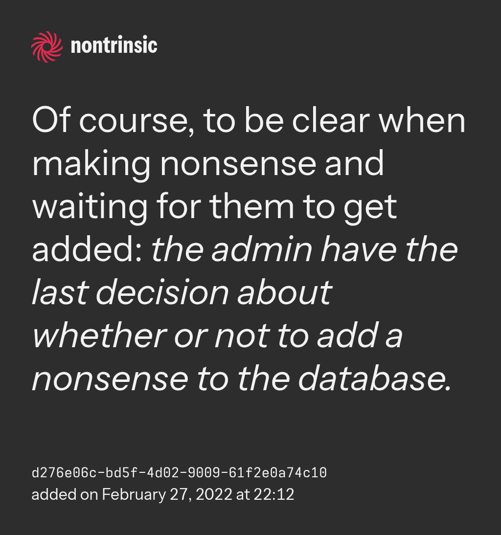 teilenOf course, to be clear when making nonsense and waiting for them to get added: the admin have the last decision about whether or not to add a nonsense to the database.
