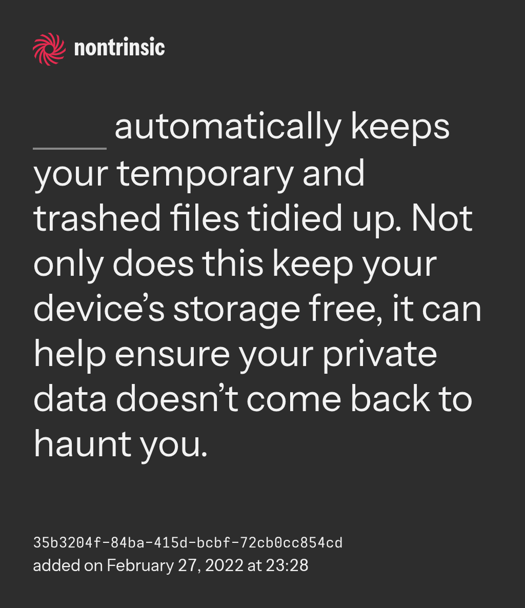 automatically keeps your temporary and trashed files tidied up. Not only does this keep your device’s storage free, it can help ensure your private data doesn’t come back to haunt you.