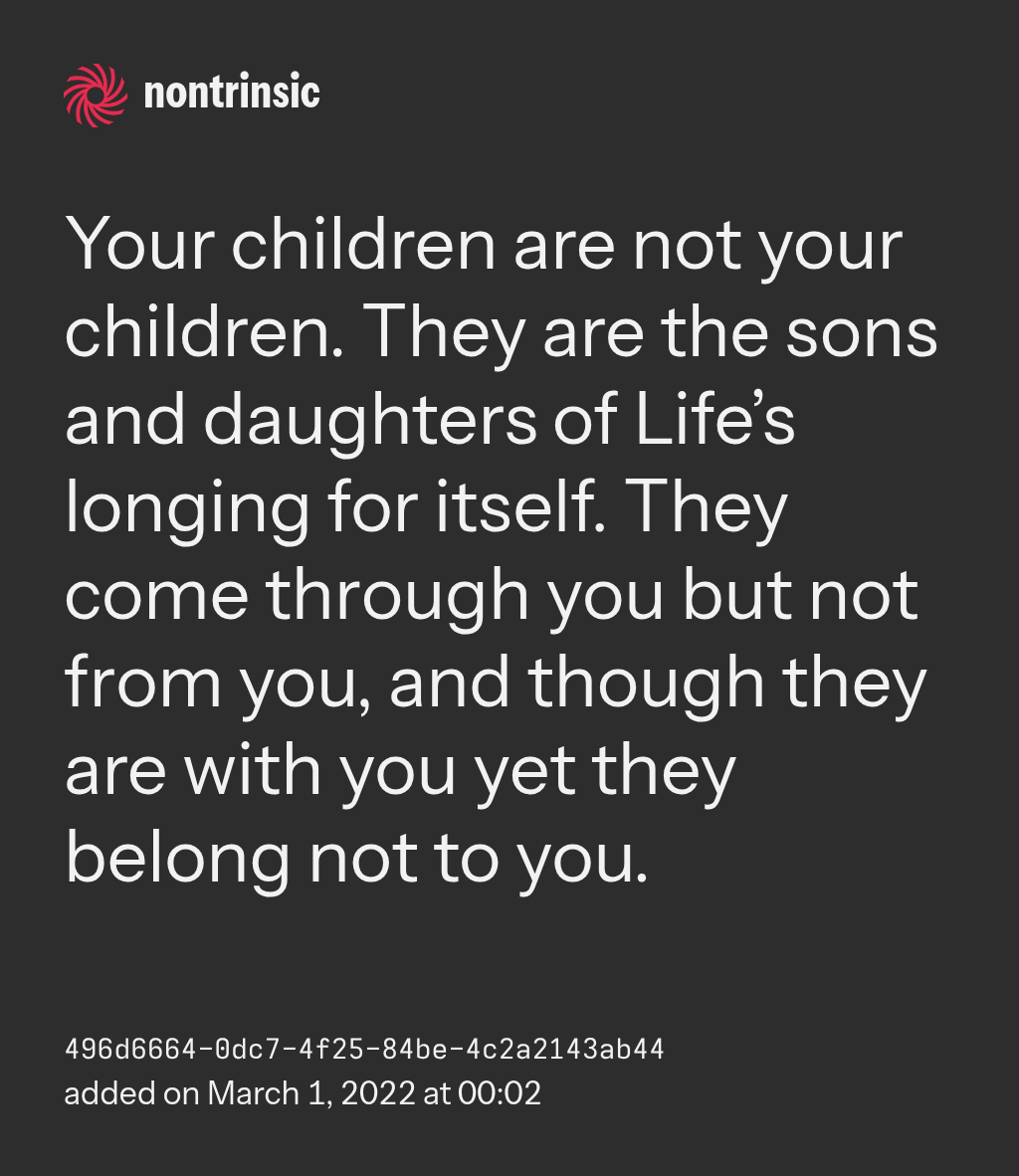 teilenYour children are not your children. They are the sons and daughters of Life’s longing for itself. They come through you but not from you, and though they are with you yet they belong not to you.