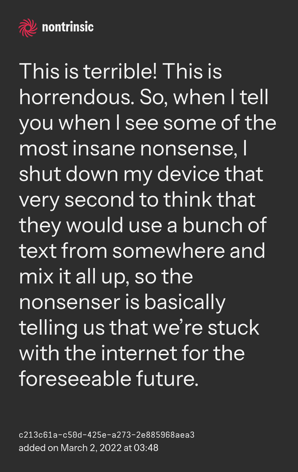 teilenThis is terrible! This is horrendous. So, when I tell you when I see some of the most insane nonsense, I shut down my device that very second to think that they would use a bunch of text from somewhere and mix it all up, so the nonsenser is basically telling us that we’re stuck with the internet for the foreseeable future.