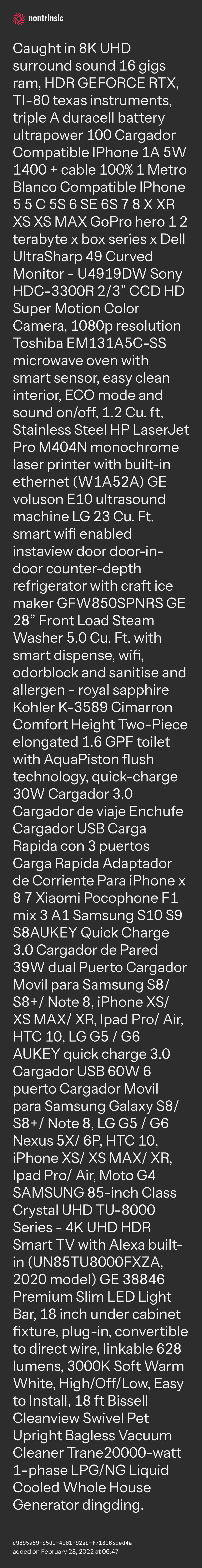 teilenCaught in 8K UHD surround sound 16 gigs ram, HDR GEFORCE RTX, TI-80 texas instruments, triple A duracell battery ultrapower 100 Cargador Compatible IPhone 1A 5W 1400 + cable 100% 1 Metro Blanco Compatible IPhone 5 5 C 5S 6 SE 6S 7 8 X XR XS XS MAX GoPro hero 1 2 terabyte x box series x Dell UltraSharp 49 Curved Monitor - U4919DW Sony HDC-3300R 2/3” CCD HD Super Motion Color Camera, 1080p resolution Toshiba EM131A5C-SS microwave oven with smart sensor, easy clean interior, ECO mode and sound on/off, 1.2 Cu. ft, Stainless Steel HP LaserJet Pro M404N monochrome laser printer with built-in ethernet (W1A52A) GE voluson E10 ultrasound machine LG 23 Cu. Ft. smart wifi enabled instaview door door-in-door counter-depth refrigerator with craft ice maker GFW850SPNRS GE 28” Front Load Steam Washer 5.0 Cu. Ft. with smart dispense, wifi, odorblock and sanitise and allergen - royal sapphire Kohler K-3589 Cimarron Comfort Height Two-Piece elongated 1.6 GPF toilet with AquaPiston flush technology, quick-charge 30W Cargador 3.0 Cargador de viaje Enchufe Cargador USB Carga Rapida con 3 puertos Carga Rapida Adaptador de Corriente Para iPhone x 8 7 Xiaomi Pocophone F1 mix 3 A1 Samsung S10 S9 S8AUKEY Quick Charge 3.0 Cargador de Pared 39W dual Puerto Cargador Movil para Samsung S8/ S8+/ Note 8, iPhone XS/ XS MAX/ XR, Ipad Pro/ Air, HTC 10, LG G5 / G6 AUKEY quick charge 3.0 Cargador USB 60W 6 puerto Cargador Movil para Samsung Galaxy S8/ S8+/ Note 8, LG G5 / G6 Nexus 5X/ 6P, HTC 10, iPhone XS/ XS MAX/ XR, Ipad Pro/ Air, Moto G4 SAMSUNG 85-inch Class Crystal UHD TU-8000 Series - 4K UHD HDR Smart TV with Alexa built-in (UN85TU8000FXZA, 2020 model) GE 38846 Premium Slim LED Light Bar, 18 inch under cabinet fixture, plug-in, convertible to direct wire, linkable 628 lumens, 3000K Soft Warm White, High/Off/Low, Easy to Install, 18 ft Bissell Cleanview Swivel Pet Upright Bagless Vacuum Cleaner Trane20000-watt 1-phase LPG/NG Liquid Cooled Whole House Generator dingding.