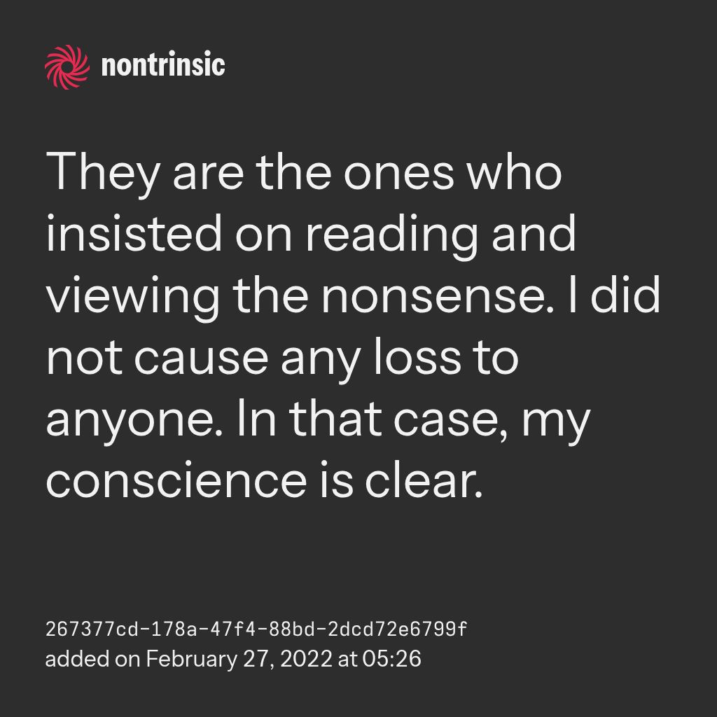 teilenThey are the ones who insisted on reading and viewing the nonsense. I did not cause any loss to anyone. In that case, my conscience is clear.