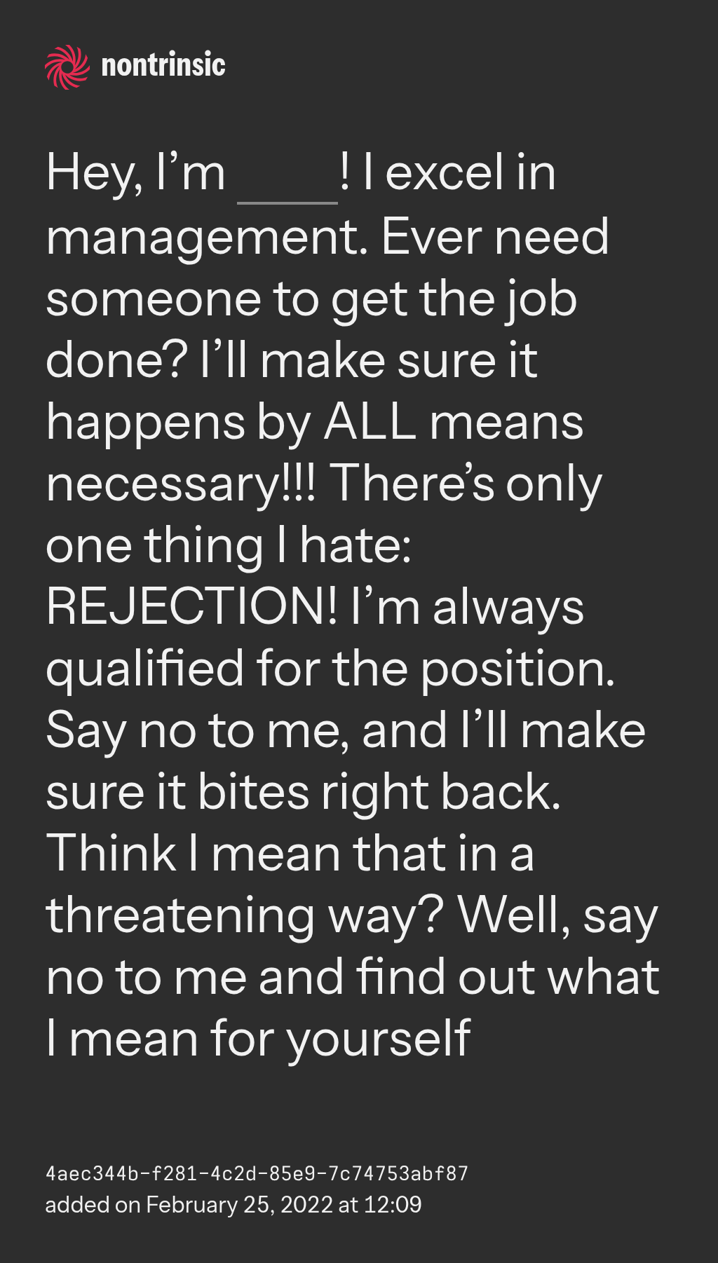 ! I excel in management. Ever need someone to get the job done? I’ll make sure it happens by ALL means necessary!!! There’s only one thing I hate: REJECTION! I’m always qualified for the position. Say no to me, and I’ll make sure it bites right back. Think I mean that in a threatening way? Well, say no to me and find out what I mean for yourself