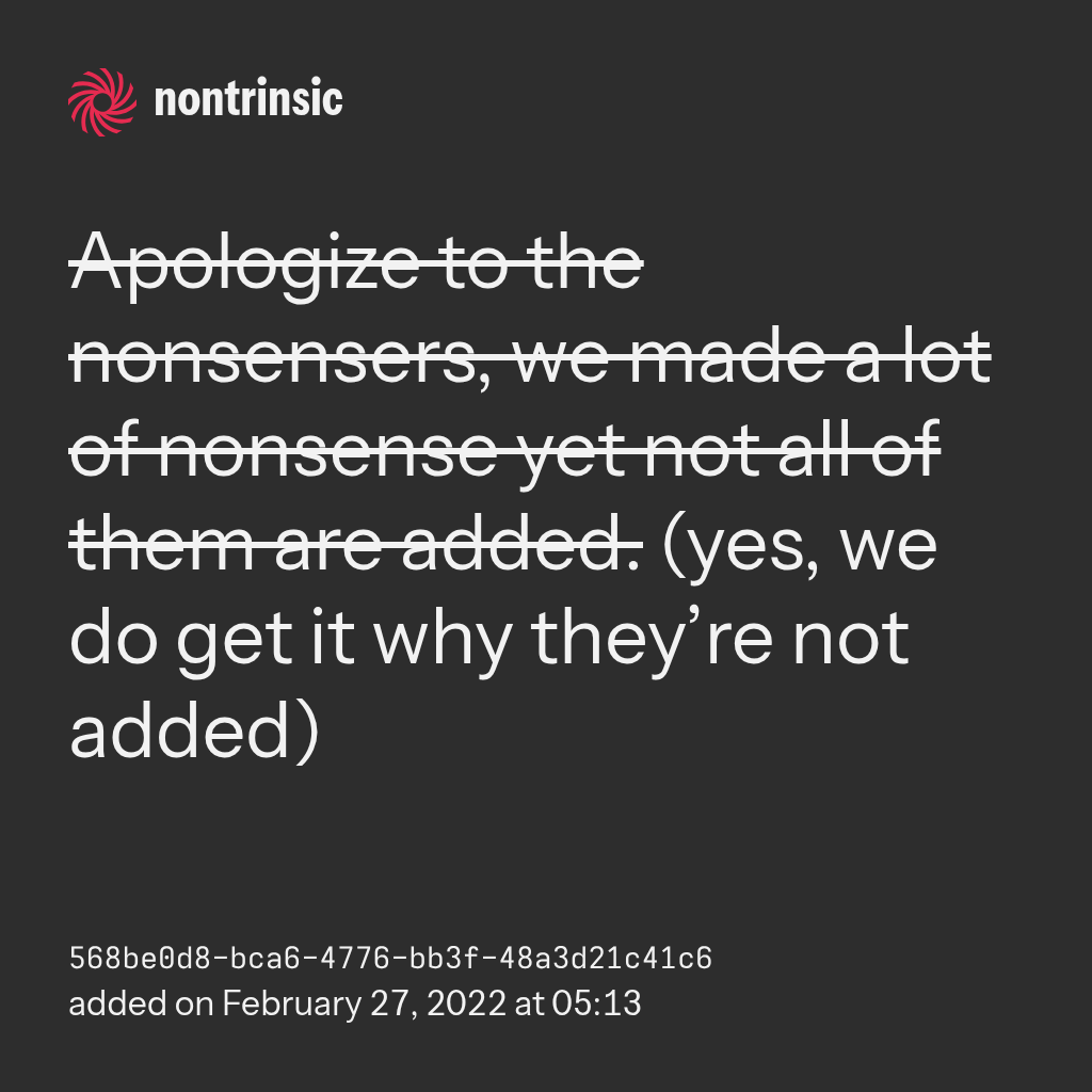 teilenApologize to the nonsensers, we made a lot of nonsense yet not all of them are added. (yes, we do get it why they’re not added)