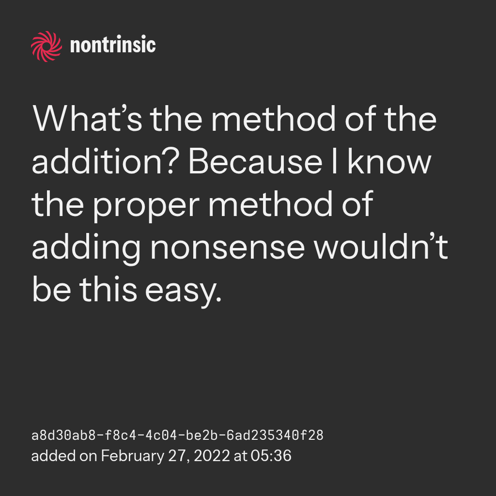 teilenWhat’s the method of the addition? Because I know the proper method of adding nonsense wouldn’t be this easy.