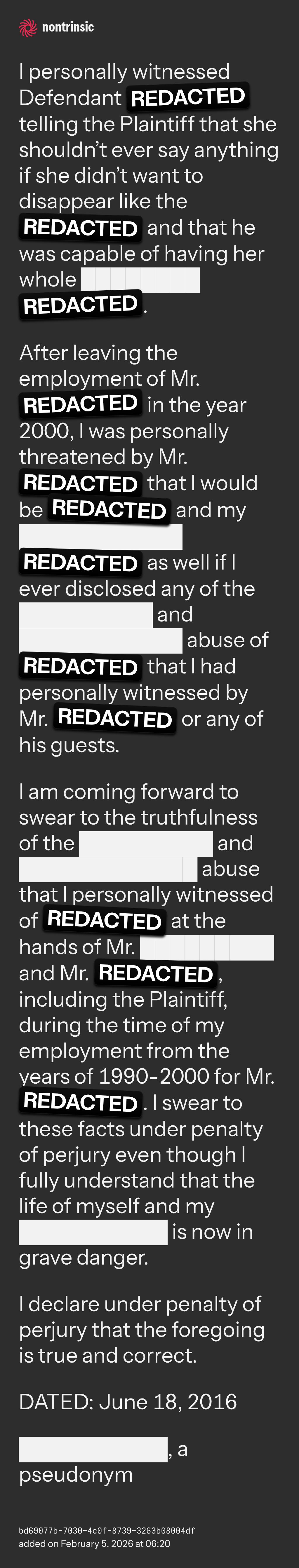 I am coming forward to swear to the truthfulness of the and abuse that I personally witnessed of REDACTED at the hands of Mr. and Mr. REDACTED, including the Plaintiff, during the time of my employment from the years of 1990-2000 for Mr. REDACTED. I swear to these facts under penalty of perjury even though I fully understand that the life of myself and my is now in grave danger.