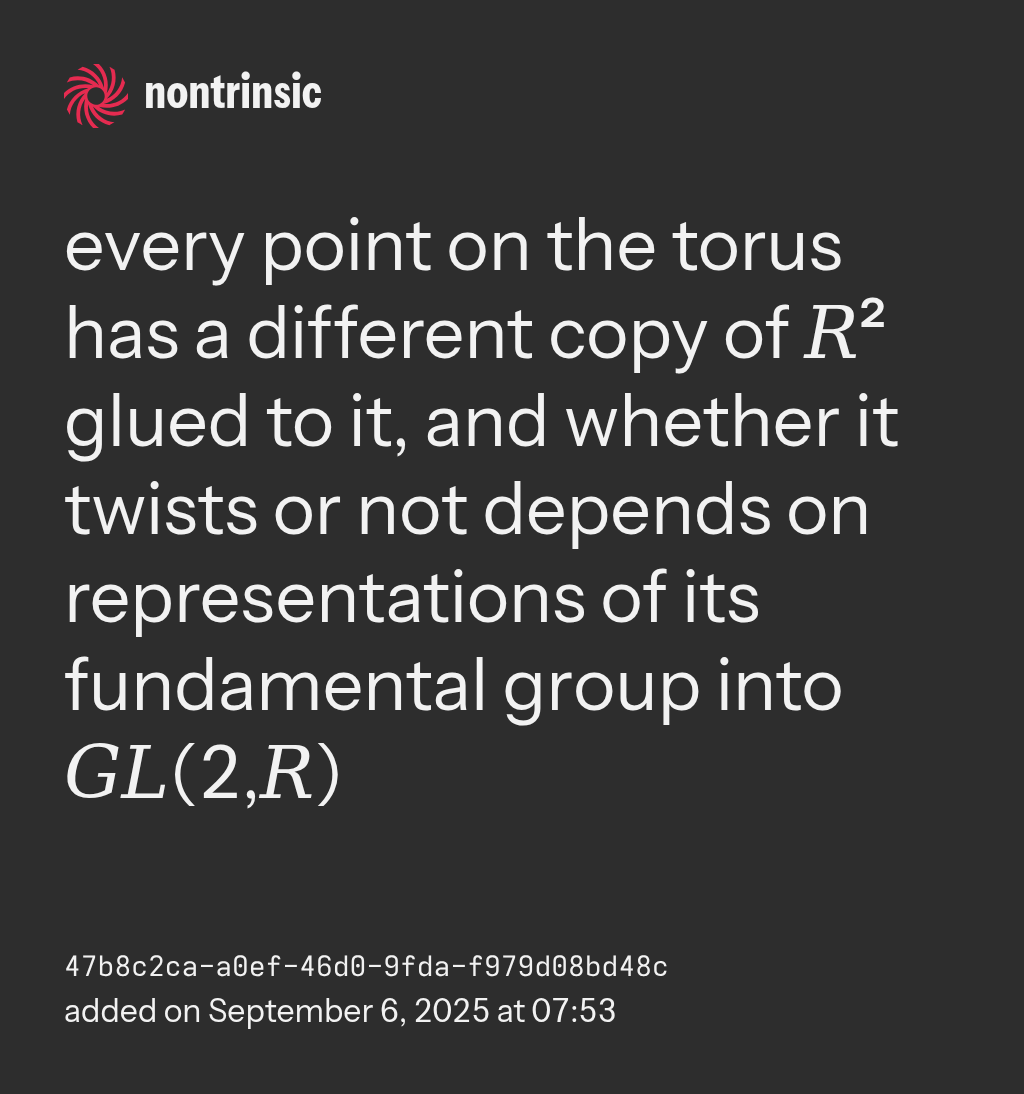 shareevery point on the torus has a different copy of 𝑅² glued to it, and whether it twists or not depends on representations of its fundamental group into 𝐺𝐿(2,𝑅)