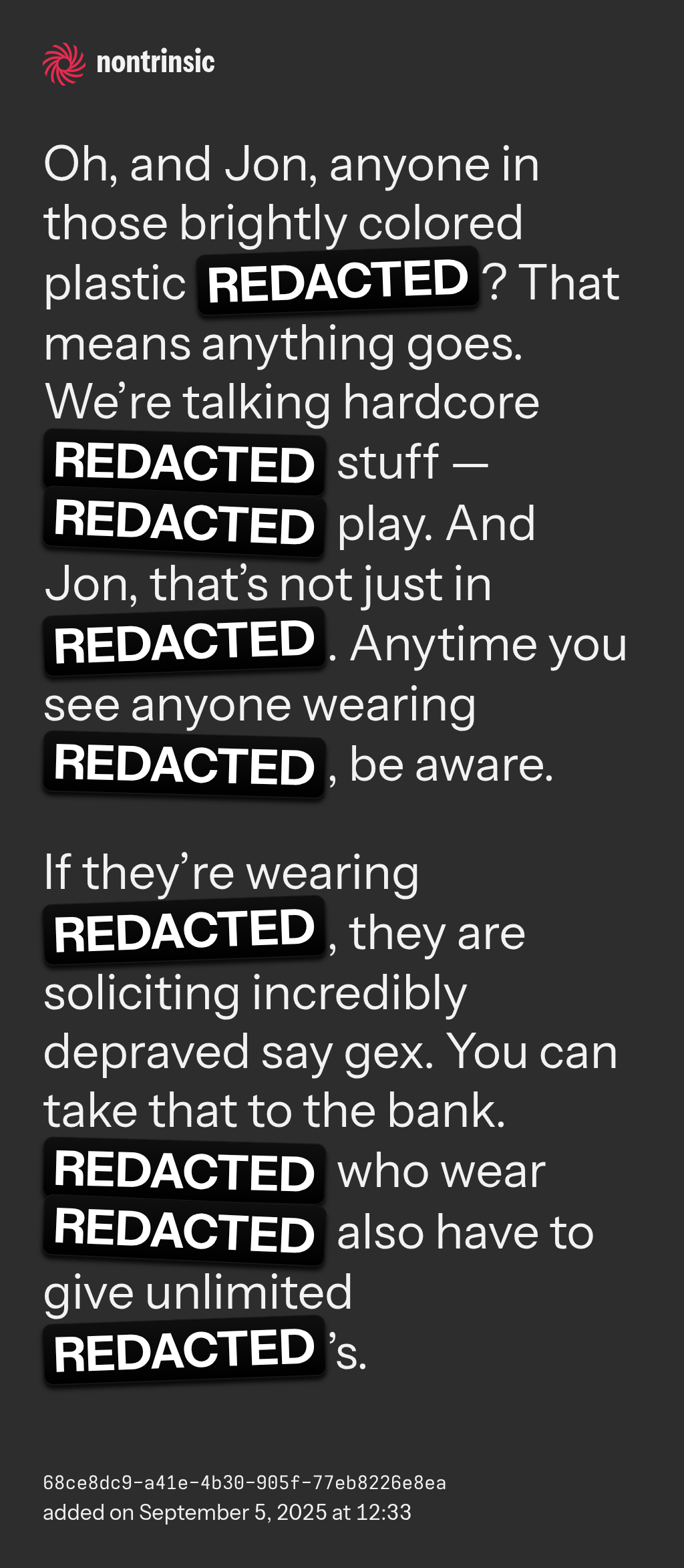 If they’re wearing REDACTED, they are soliciting incredibly depraved say gex. You can take that to the bank. REDACTED who wear REDACTED also have to give unlimited REDACTED’s.