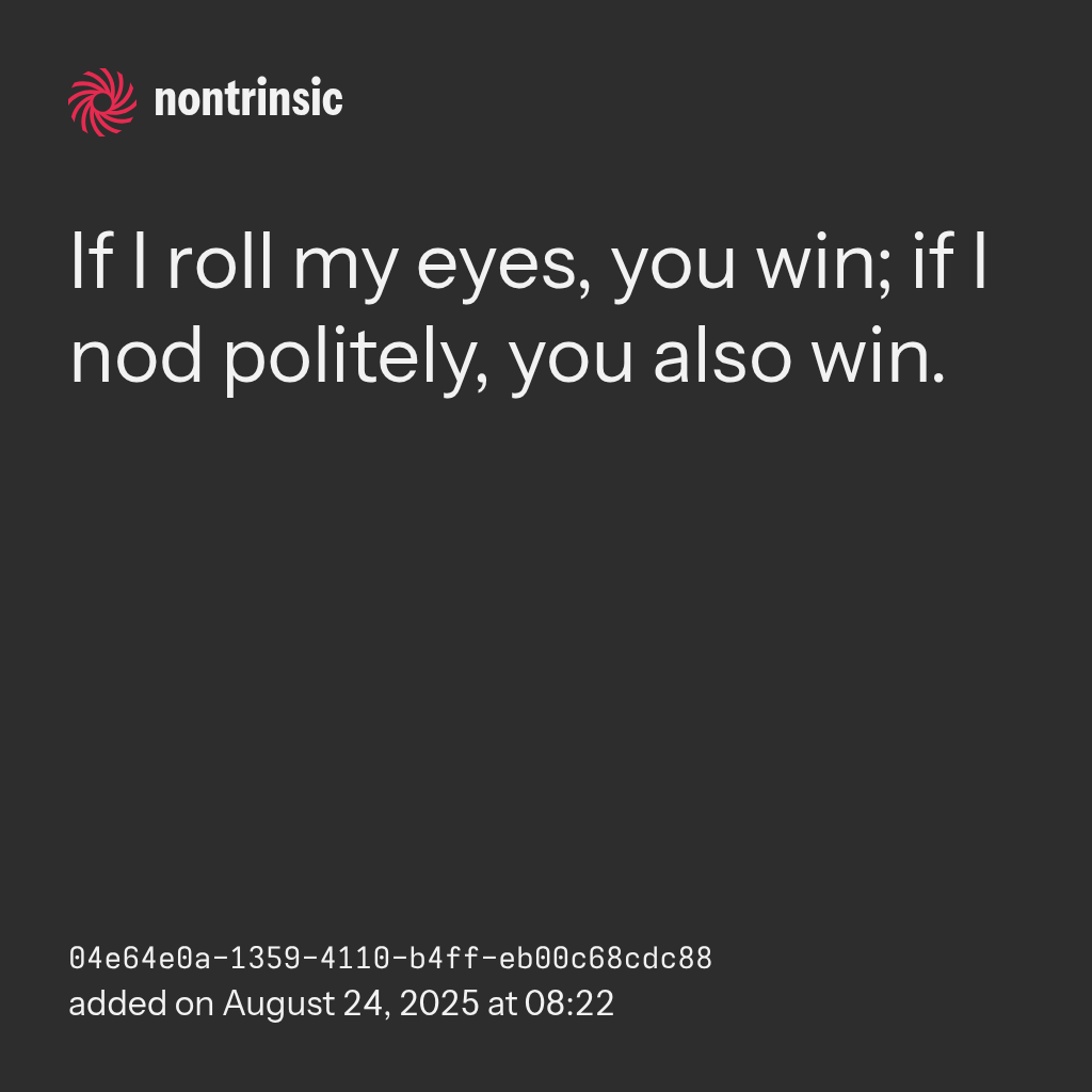 shareIf I roll my eyes, you win; if I nod politely, you also win.