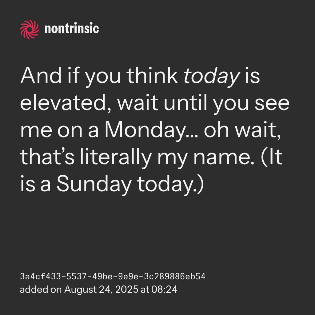 shareAnd if you think today is elevated, wait until you see me on a Monday… oh wait, that’s literally my name. (It is a Sunday today.)
