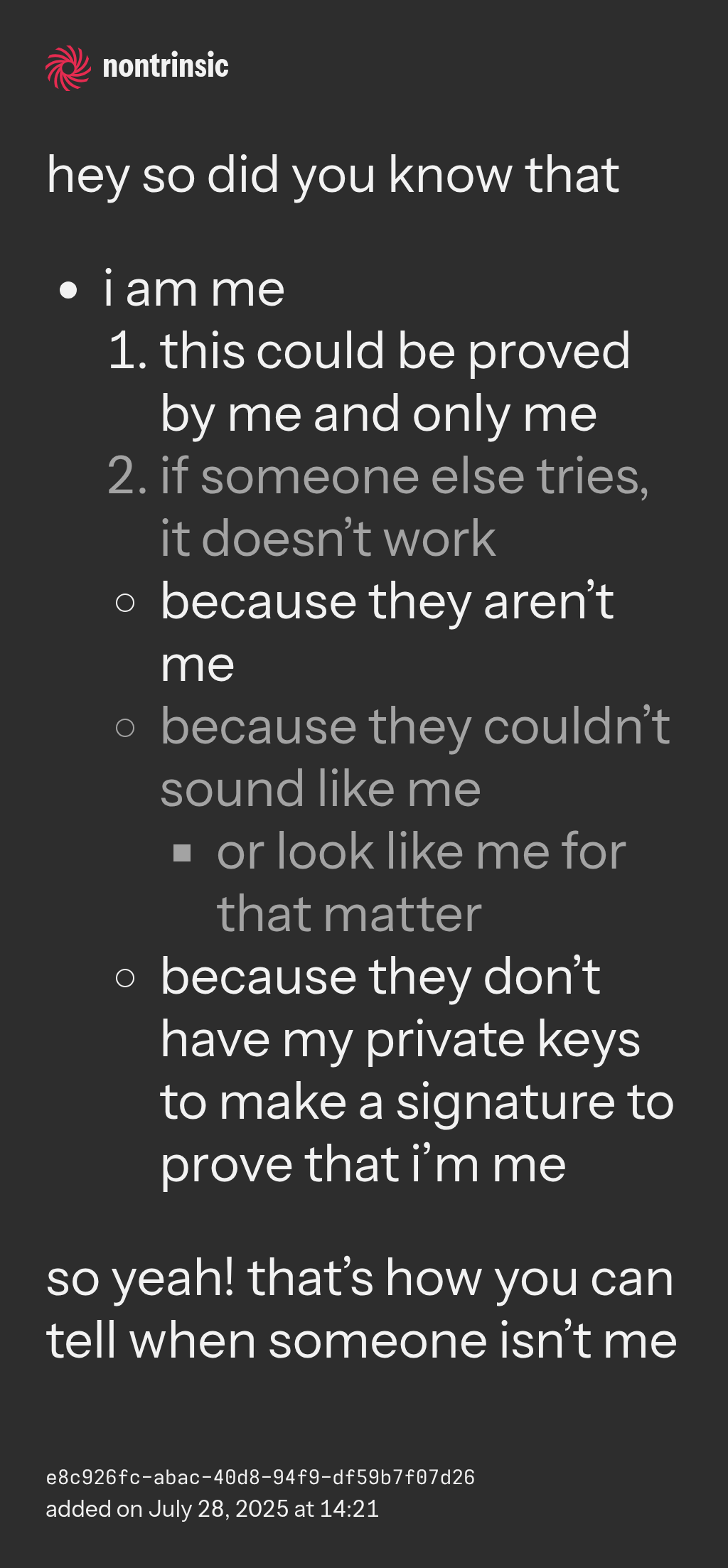 - because they don’t have my private keys to make a signature to prove that i’m me