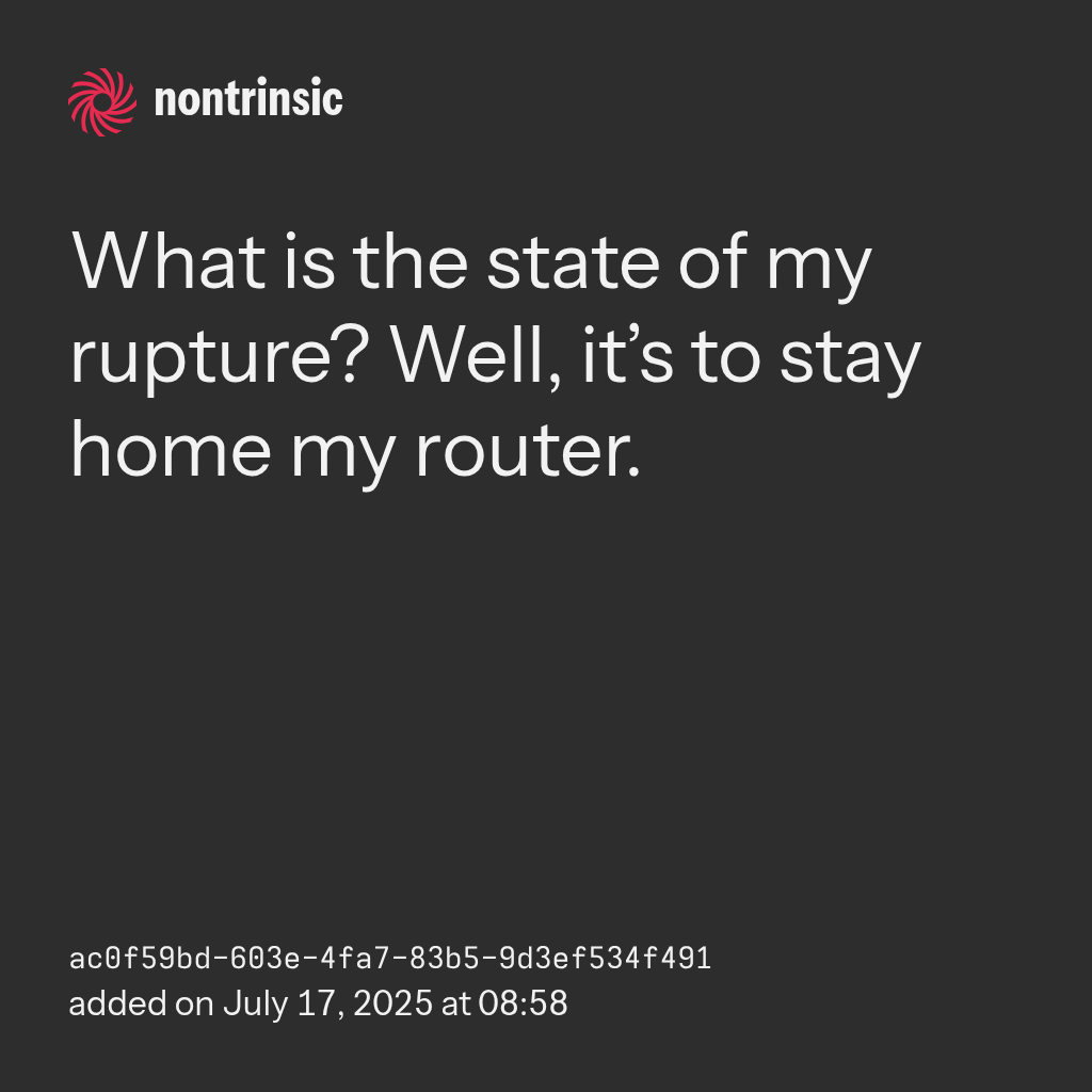shareWhat is the state of my rupture? Well, it’s to stay home my router.