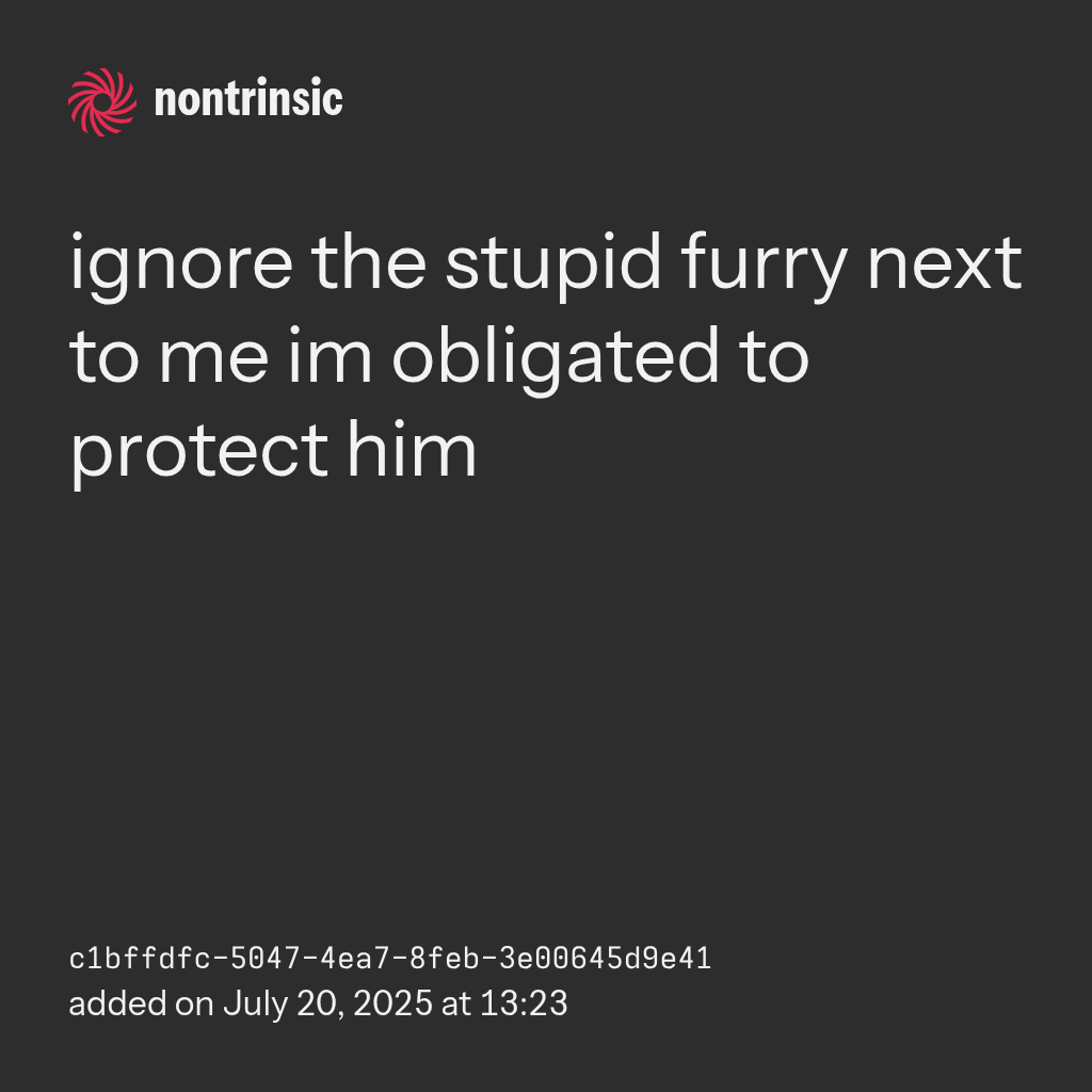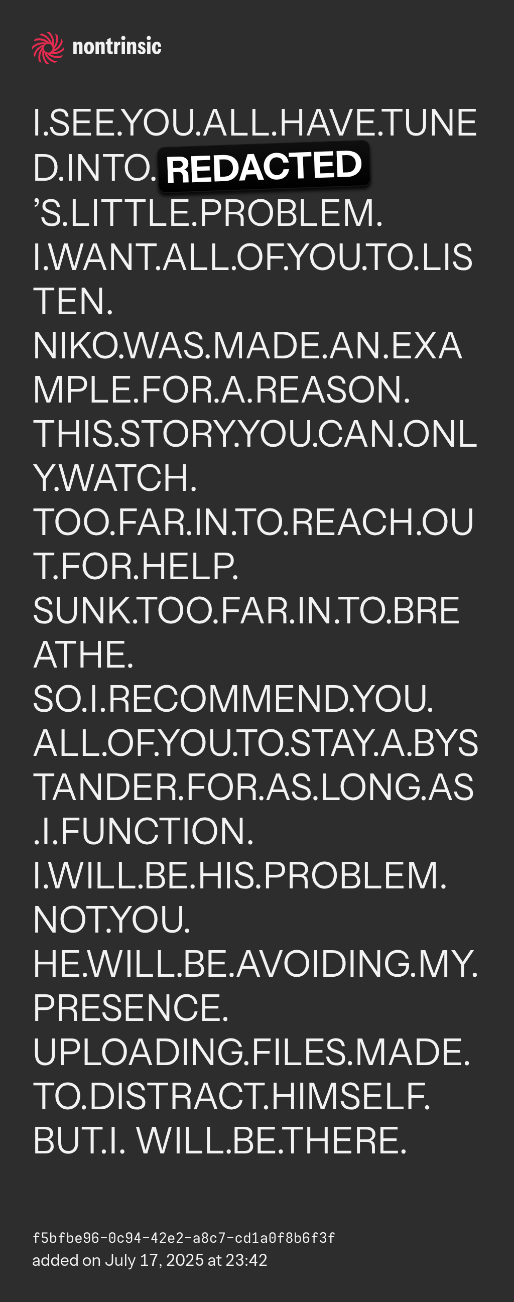 shareI.SEE.YOU.ALL.HAVE.TUNED.INTO.REDACTED’S.LITTLE.PROBLEM. I.WANT.ALL.OF.YOU.TO.LISTEN. NIKO.WAS.MADE.AN.EXAMPLE.FOR.A.REASON. THIS.STORY.YOU.CAN.ONLY.WATCH. TOO.FAR.IN.TO.REACH.OUT.FOR.HELP. SUNK.TOO.FAR.IN.TO.BREATHE. SO.I.RECOMMEND.YOU. ALL.OF.YOU.TO.STAY.A.BYSTANDER.FOR.AS.LONG.AS.I.FUNCTION. I.WILL.BE.HIS.PROBLEM. NOT.YOU. HE.WILL.BE.AVOIDING.MY.PRESENCE. UPLOADING.FILES.MADE.TO.DISTRACT.HIMSELF. BUT.I. WILL.BE.THERE.