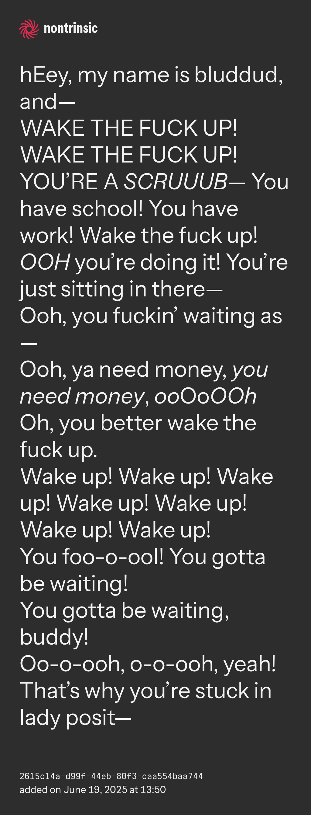 WAKE THE FUCK UP! WAKE THE FUCK UP! YOU’RE A SCRUUUB— You have school! You have work! Wake the fuck up!