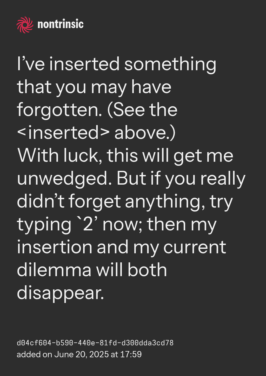 With luck, this will get me unwedged. But if you really didn’t forget anything, try typing `2’ now; then my insertion and my current dilemma will both disappear.