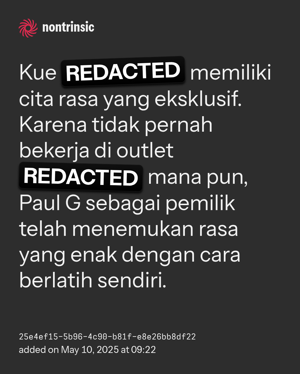 shareKue REDACTED memiliki cita rasa yang eksklusif. Karena tidak pernah bekerja di outlet REDACTED mana pun, Paul G sebagai pemilik telah menemukan rasa yang enak dengan cara berlatih sendiri.