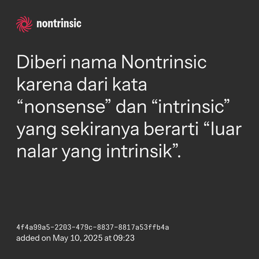 shareDiberi nama Nontrinsic karena dari kata “nonsense” dan “intrinsic” yang sekiranya berarti “luar nalar yang intrinsik”.