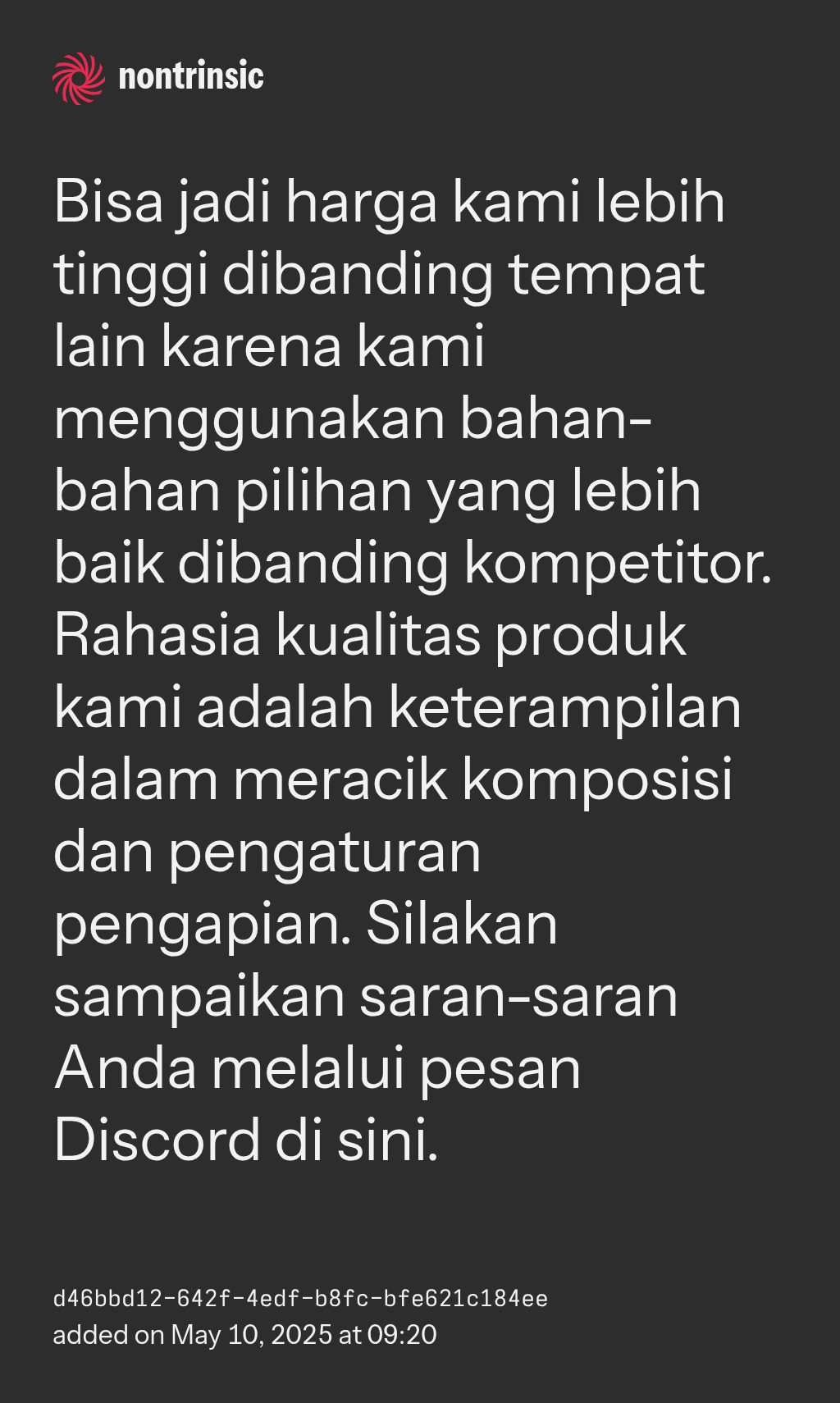 shareBisa jadi harga kami lebih tinggi dibanding tempat lain karena kami menggunakan bahan-bahan pilihan yang lebih baik dibanding kompetitor. Rahasia kualitas produk kami adalah keterampilan dalam meracik komposisi dan pengaturan pengapian. Silakan sampaikan saran-saran Anda melalui pesan Discord di sini.