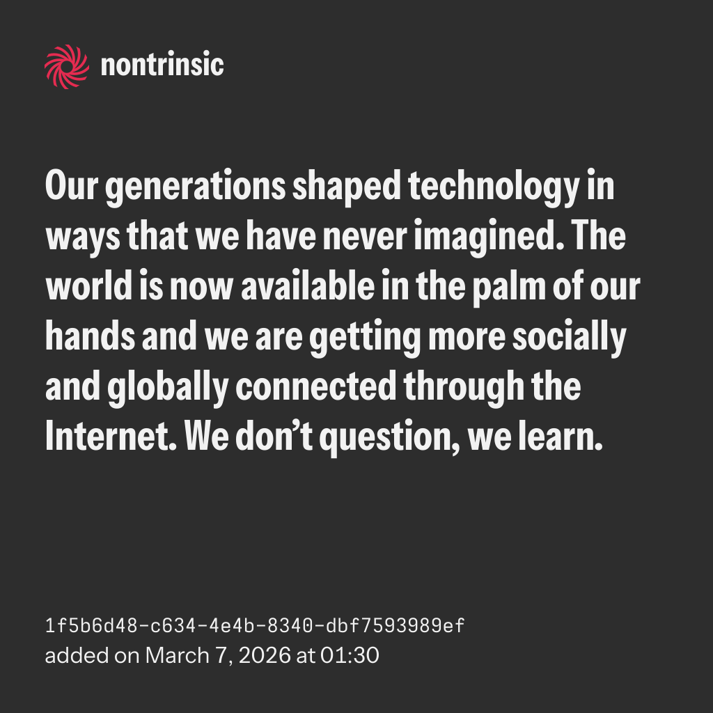 shareOur generations shaped technology in ways that we have never imagined. The world is now available in the palm of our hands and we are getting more socially and globally connected through the Internet. We don’t question, we learn.