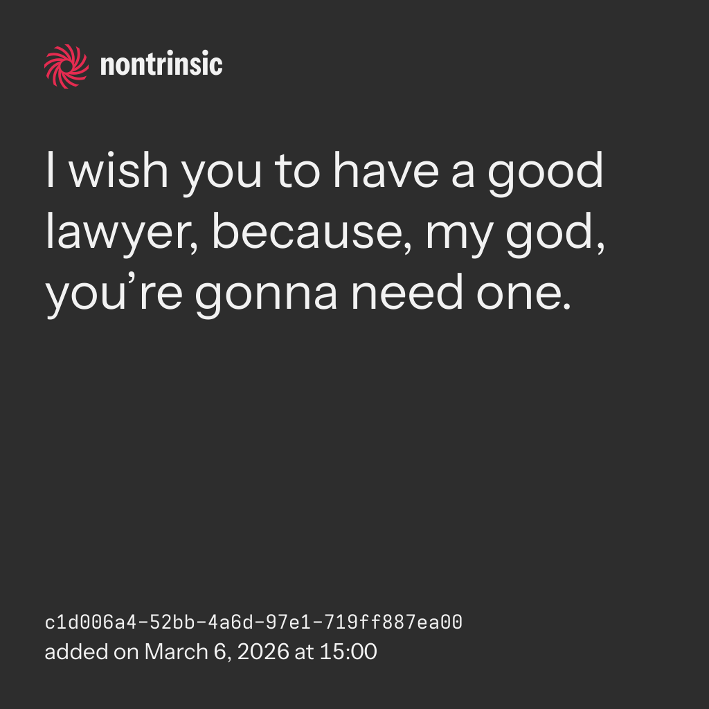 shareI wish you to have a good lawyer, because, my god, you’re gonna need one.