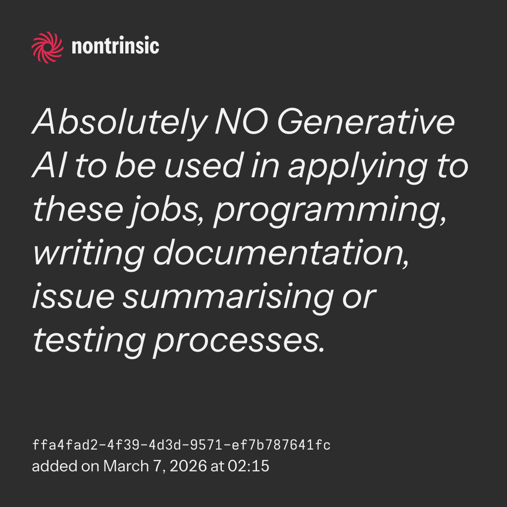 shareAbsolutely NO Generative AI to be used in applying to these jobs, programming, writing documentation, issue summarising or testing processes.
