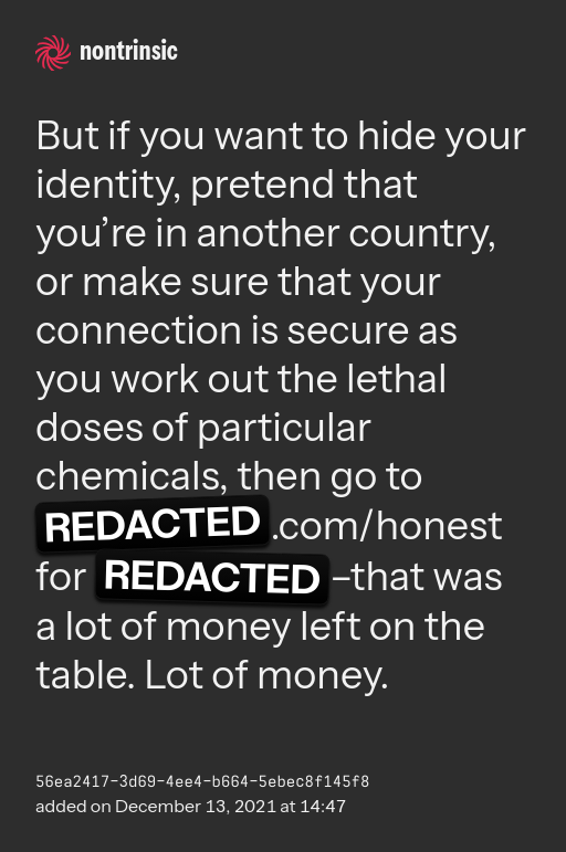 shareBut if you want to hide your identity, pretend that you’re in another country, or make sure that your connection is secure as you work out the lethal doses of particular chemicals, then go to REDACTED.com/honest for REDACTED–that was a lot of money left on the table. Lot of money.