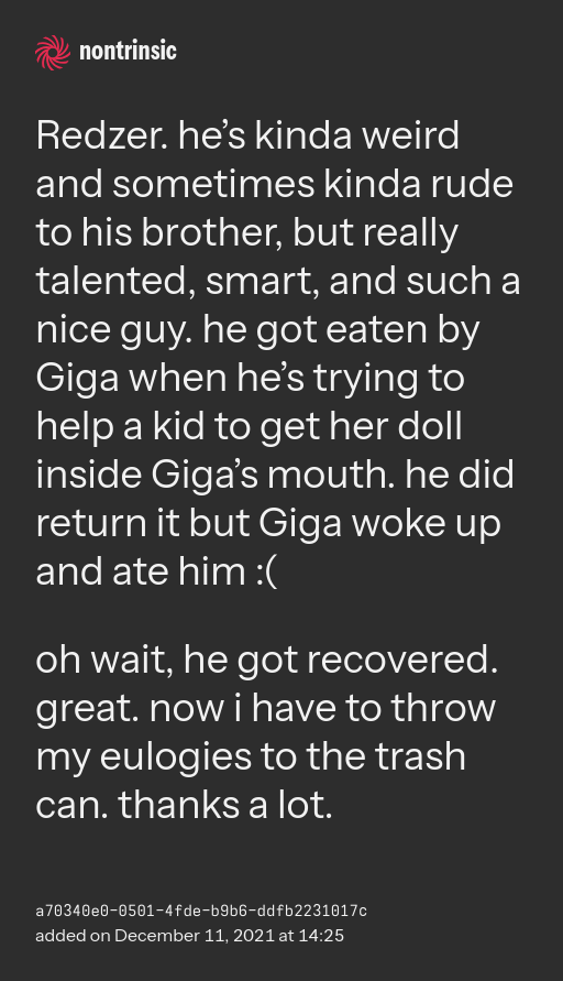 shareRedzer. he’s kinda weird and sometimes kinda rude to his brother, but really talented, smart, and such a nice guy. he got eaten by Giga when he’s trying to help a kid to get her doll inside Giga’s mouth. he did return it but Giga woke up and ate him :(