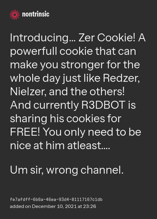 shareIntroducing… Zer Cookie! A powerfull cookie that can make you stronger for the whole day just like Redzer, Nielzer, and the others! And currently R3DBOT is sharing his cookies for FREE! You only need to be nice at him atleast….