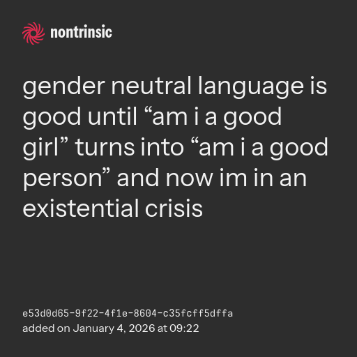sharegender neutral language is good until “am i a good girl” turns into “am i a good person” and now im in an existential crisis