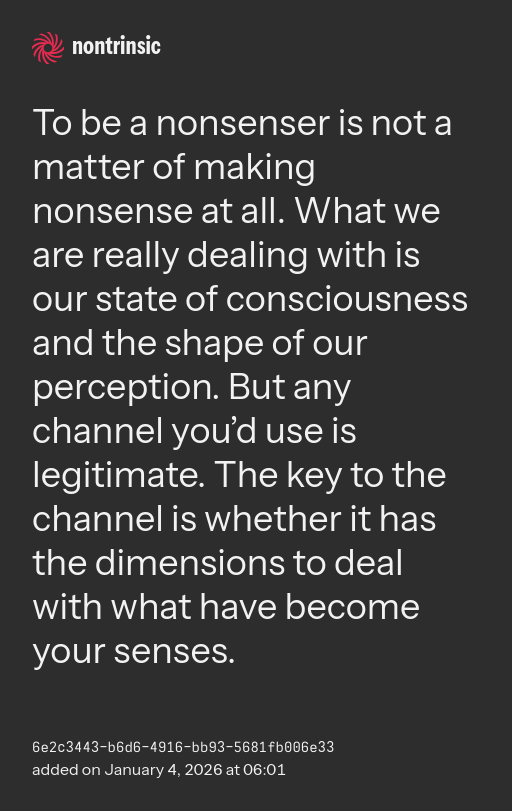 shareTo be a nonsenser is not a matter of making nonsense at all. What we are really dealing with is our state of consciousness and the shape of our perception. But any channel you’d use is legitimate. The key to the channel is whether it has the dimensions to deal with what have become your senses.