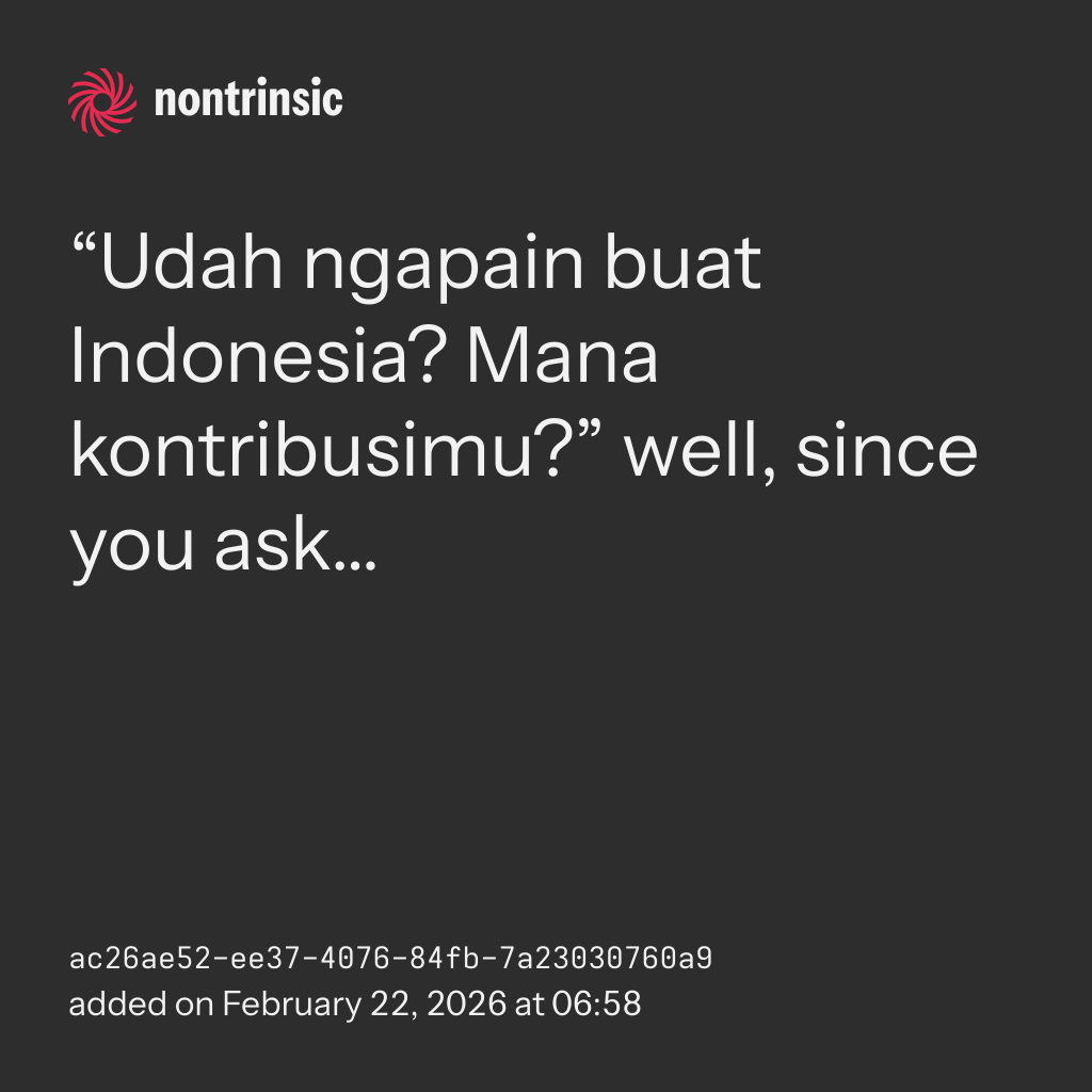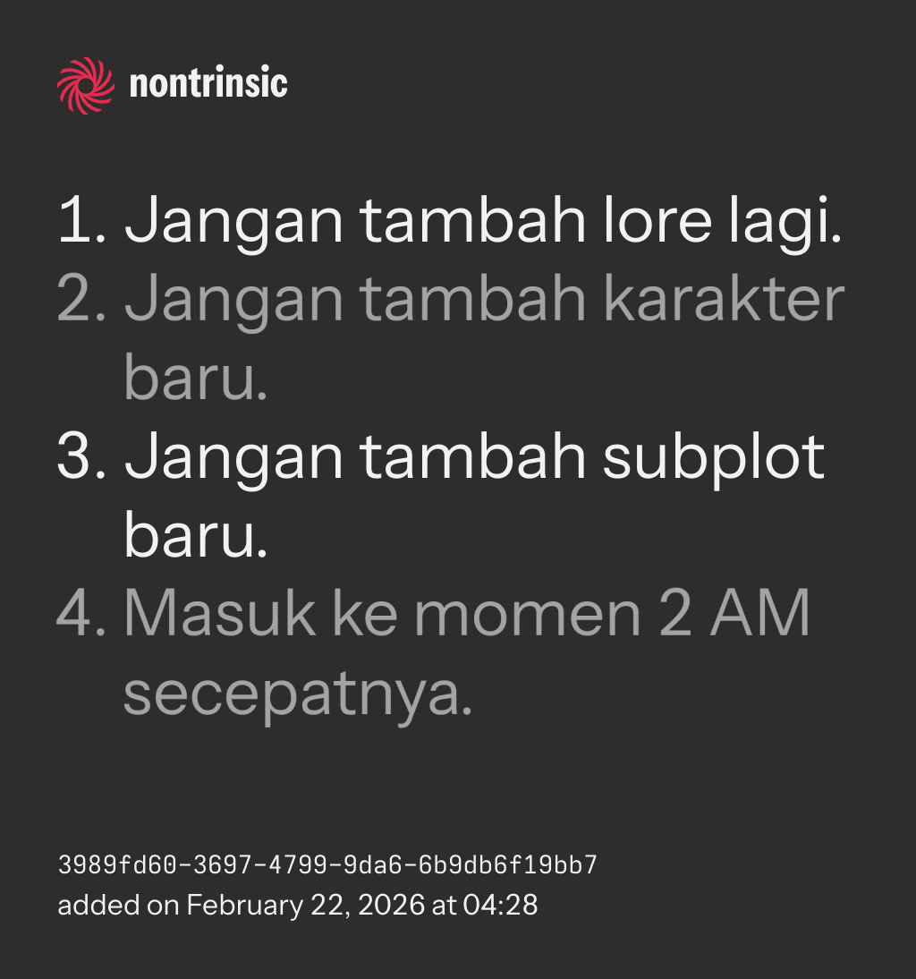 Waktu ia menyampaikan hal-hal tersebut, waktu itu masih… jam dua pagi. Tentu saja aku masih tertidur. Orang-orang lain yang merupakan kontributor mengingatkan dia, “Kamu di sini itu buat menulis hal-hal random di #nonsense, bukan untuk merusak suasana seperti ‘oohhhhh tambahkan sistem penilaian kualitas karena nonsense ini tuh mid’”. Pada akhirnya, waktu aku bangun jam sembilan pagi, aku hanya mengatakan bahwa kalimat-kalimat yang ada dalam galaksi tersebut itu tidak perlu dibaca oleh semua orang.