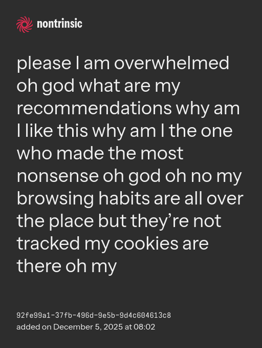shareplease I am overwhelmed oh god what are my recommendations why am I like this why am I the one who made the most nonsense oh god oh no my browsing habits are all over the place but they’re not tracked my cookies are there oh my
