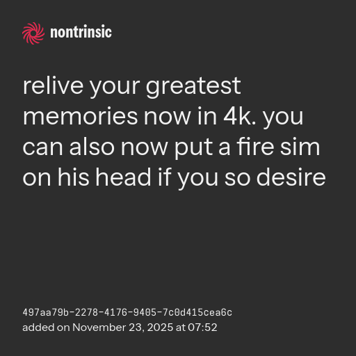 sharerelive your greatest memories now in 4k. you can also now put a fire sim on his head if you so desire