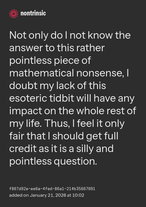 shareNot only do I not know the answer to this rather pointless piece of mathematical nonsense, I doubt my lack of this esoteric tidbit will have any impact on the whole rest of my life. Thus, I feel it only fair that I should get full credit as it is a silly and pointless question.