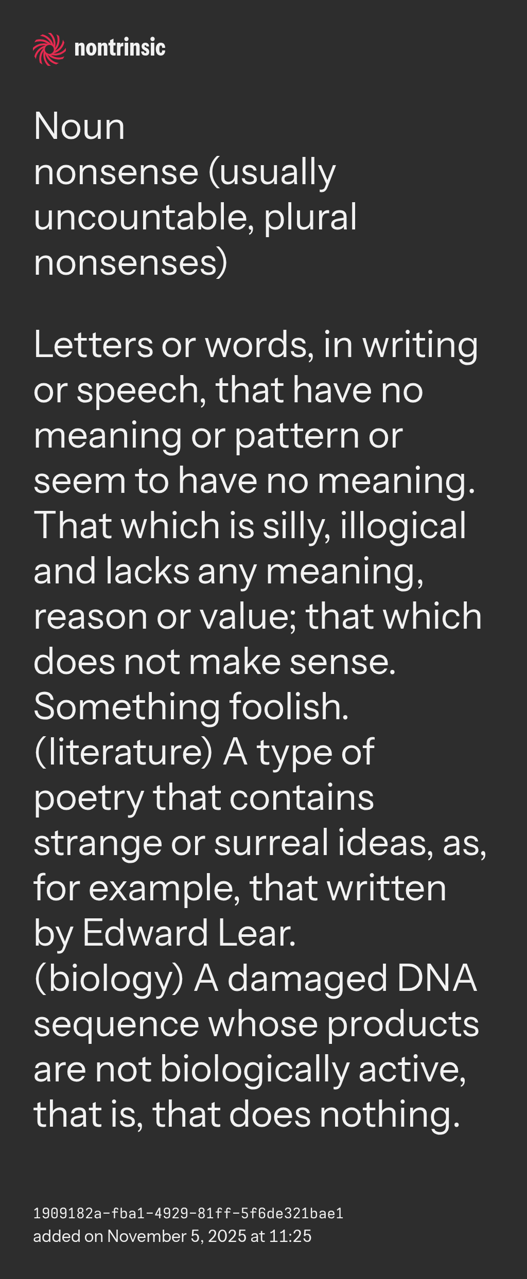 nonsense (usually uncountable, plural nonsenses)