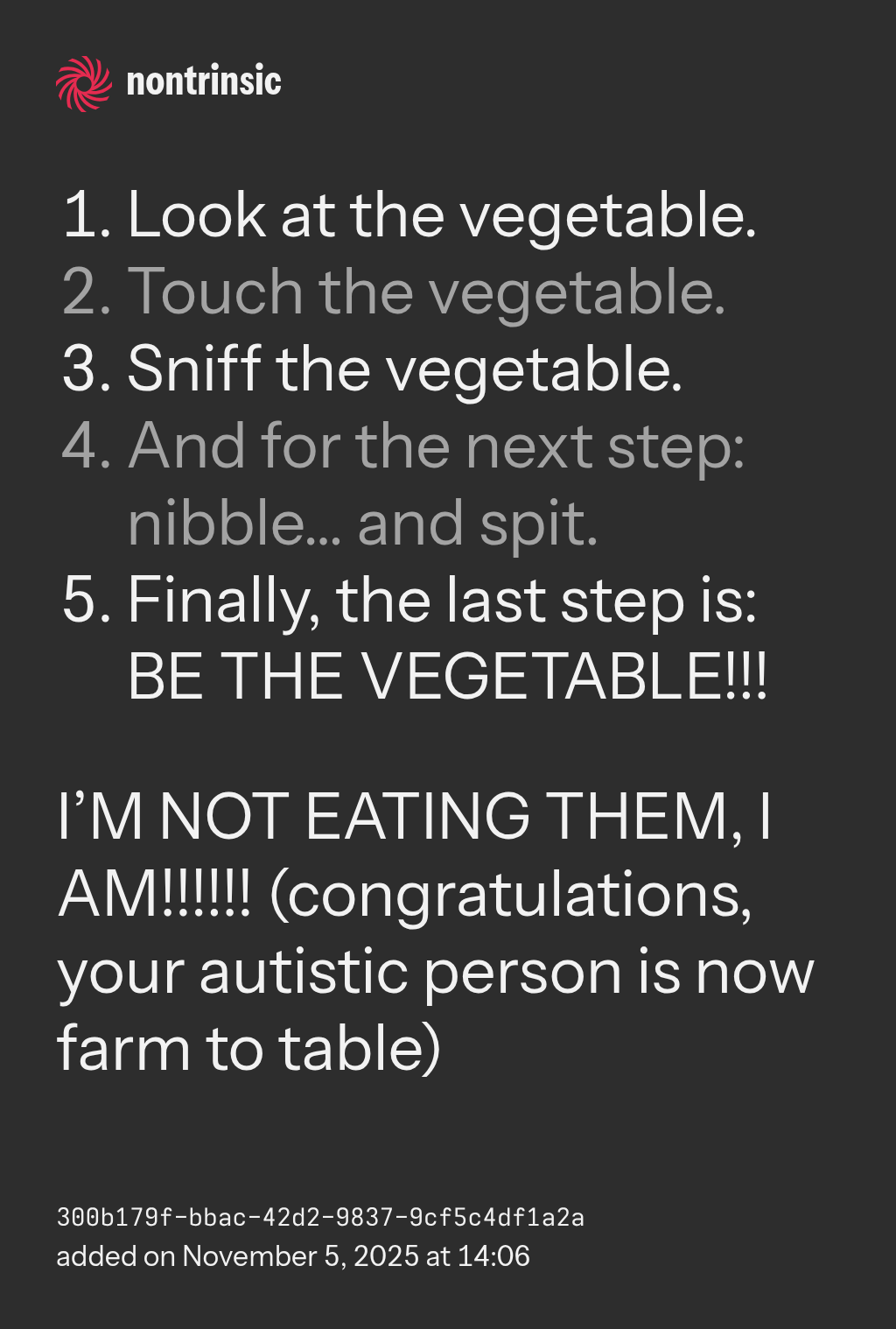 shareI’M NOT EATING THEM, I AM!!!!!! (congratulations, your autistic person is now farm to table)