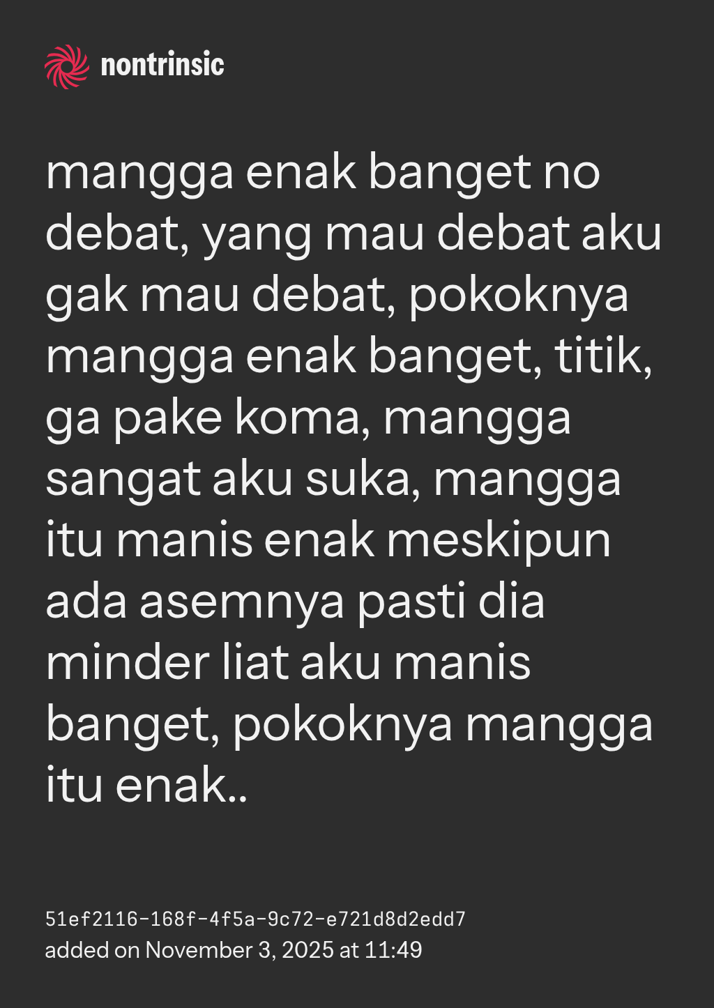 sharemangga enak banget no debat, yang mau debat aku gak mau debat, pokoknya mangga enak banget, titik, ga pake koma, mangga sangat aku suka, mangga itu manis enak meskipun ada asemnya pasti dia minder liat aku manis banget, pokoknya mangga itu enak..
