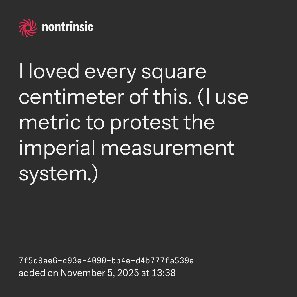 shareI loved every square centimeter of this. (I use metric to protest the imperial measurement system.)