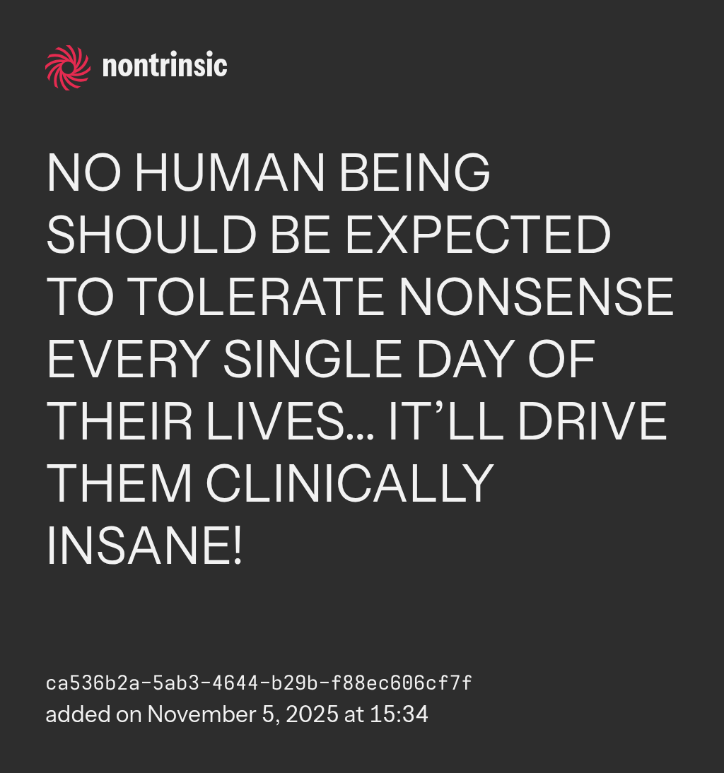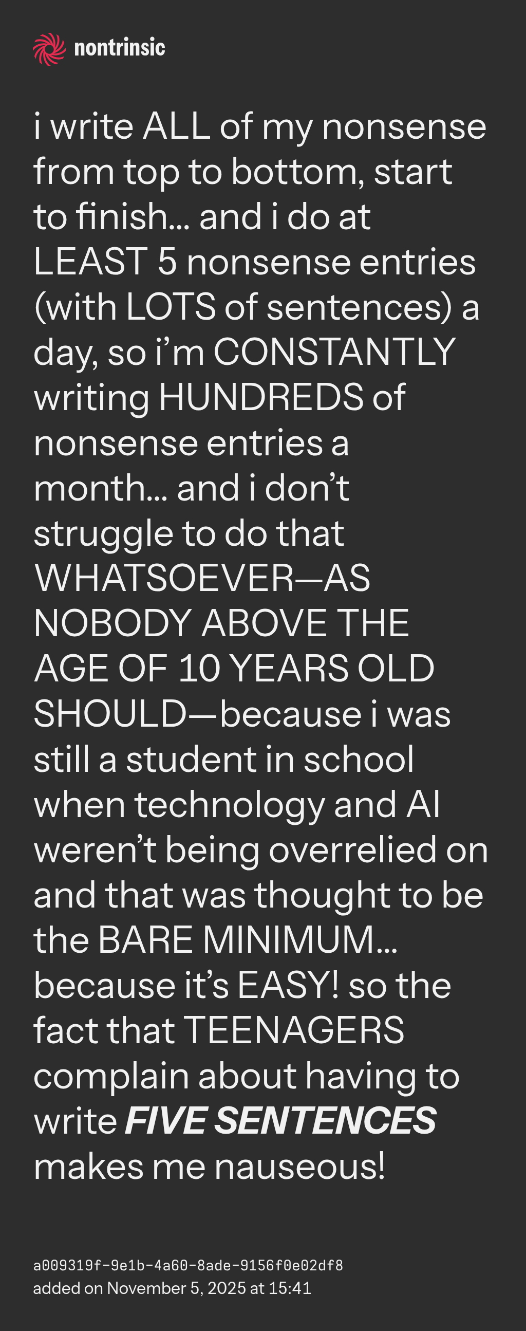 sharei write ALL of my nonsense from top to bottom, start to finish… and i do at LEAST 5 nonsense entries (with LOTS of sentences) a day, so i’m CONSTANTLY writing HUNDREDS of nonsense entries a month… and i don’t struggle to do that WHATSOEVER—AS NOBODY ABOVE THE AGE OF 10 YEARS OLD SHOULD—because i was still a student in school when technology and AI weren’t being overrelied on and that was thought to be the BARE MINIMUM… because it’s EASY! so the fact that TEENAGERS complain about having to write FIVE SENTENCES makes me nauseous!