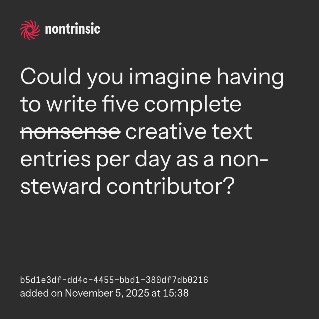 shareCould you imagine having to write five complete nonsense creative text entries per day as a non-steward contributor?