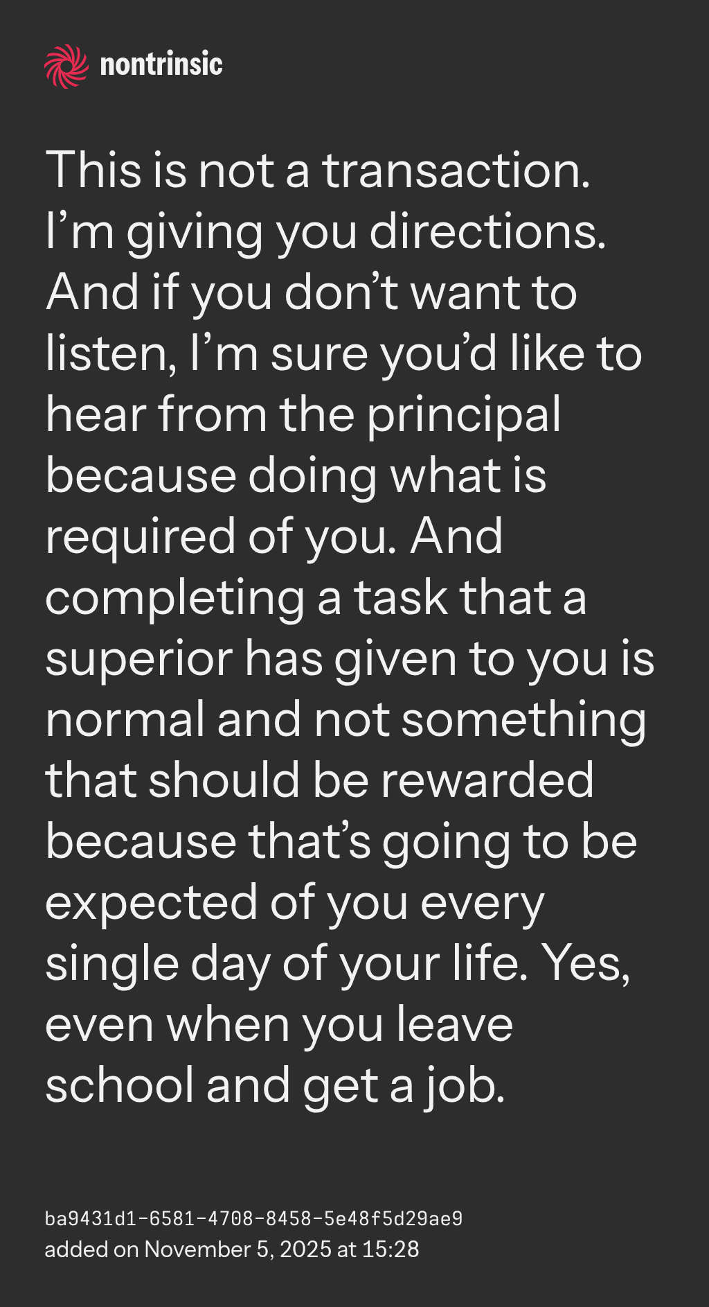 shareThis is not a transaction. I’m giving you directions. And if you don’t want to listen, I’m sure you’d like to hear from the principal because doing what is required of you. And completing a task that a superior has given to you is normal and not something that should be rewarded because that’s going to be expected of you every single day of your life. Yes, even when you leave school and get a job.