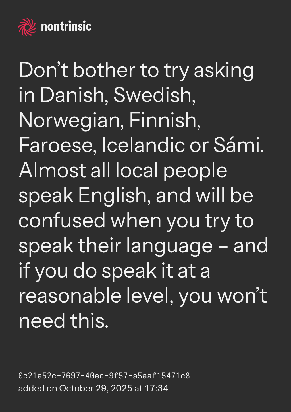 shareDon’t bother to try asking in Danish, Swedish, Norwegian, Finnish, Faroese, Icelandic or Sámi. Almost all local people speak English, and will be confused when you try to speak their language – and if you do speak it at a reasonable level, you won’t need this.
