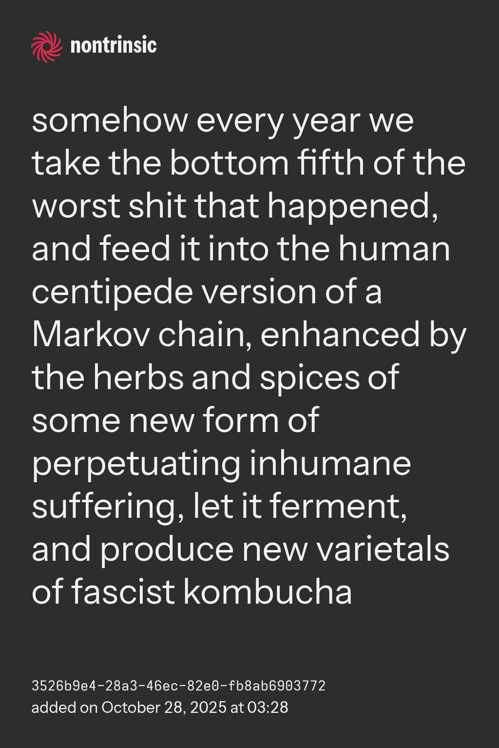 sharesomehow every year we take the bottom fifth of the worst shit that happened, and feed it into the human centipede version of a Markov chain, enhanced by the herbs and spices of some new form of perpetuating inhumane suffering, let it ferment, and produce new varietals of fascist kombucha