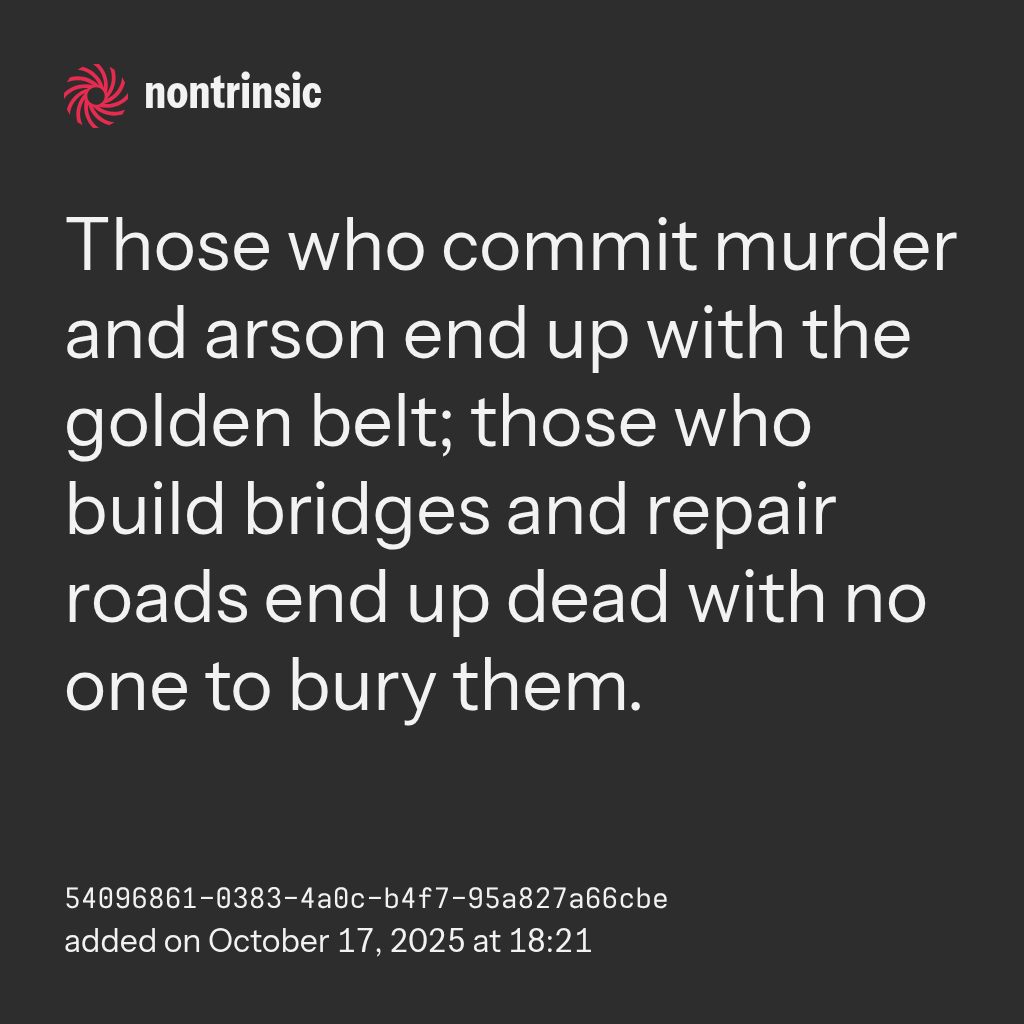 shareThose who commit murder and arson end up with the golden belt; those who build bridges and repair roads end up dead with no one to bury them.