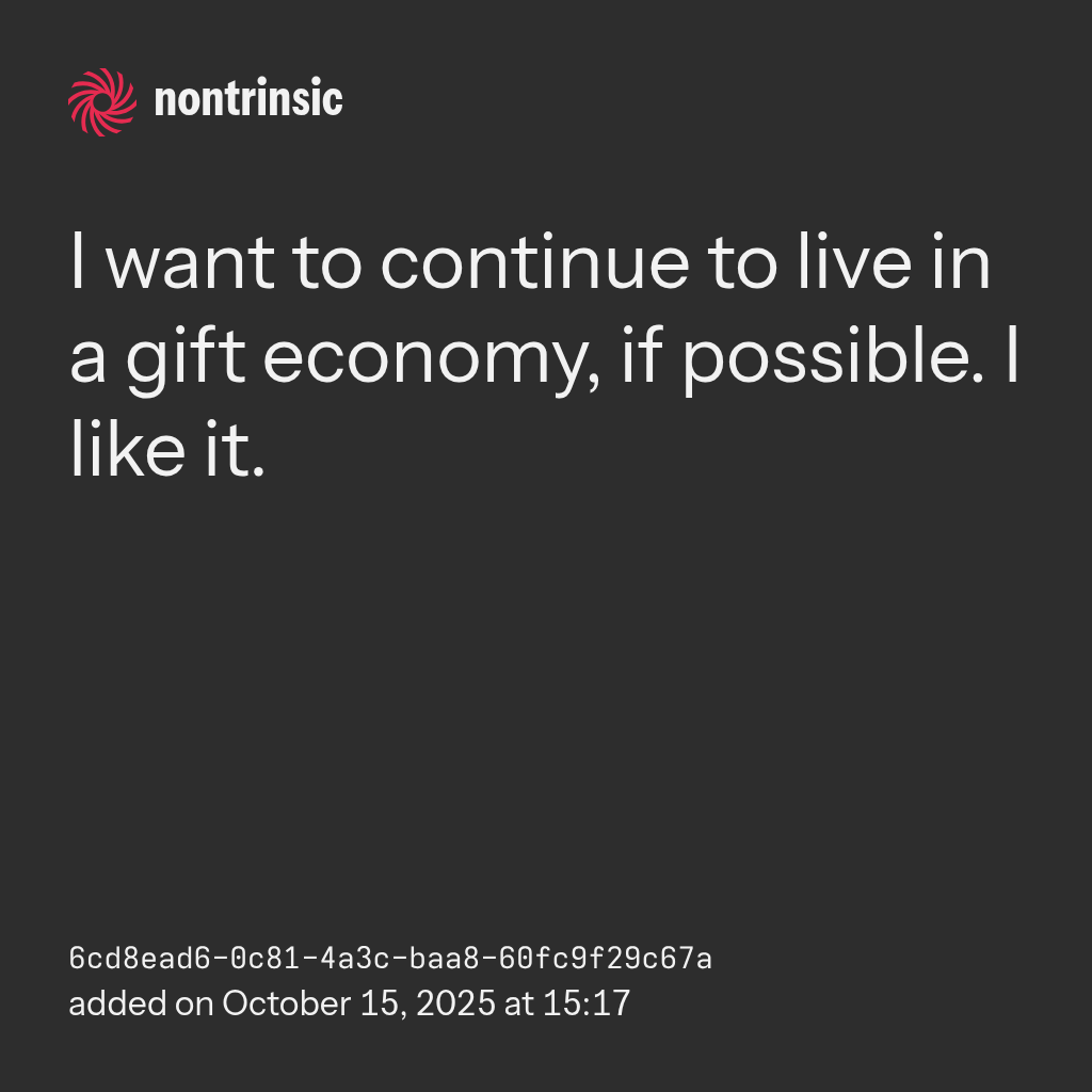 shareI want to continue to live in a gift economy, if possible. I like it.