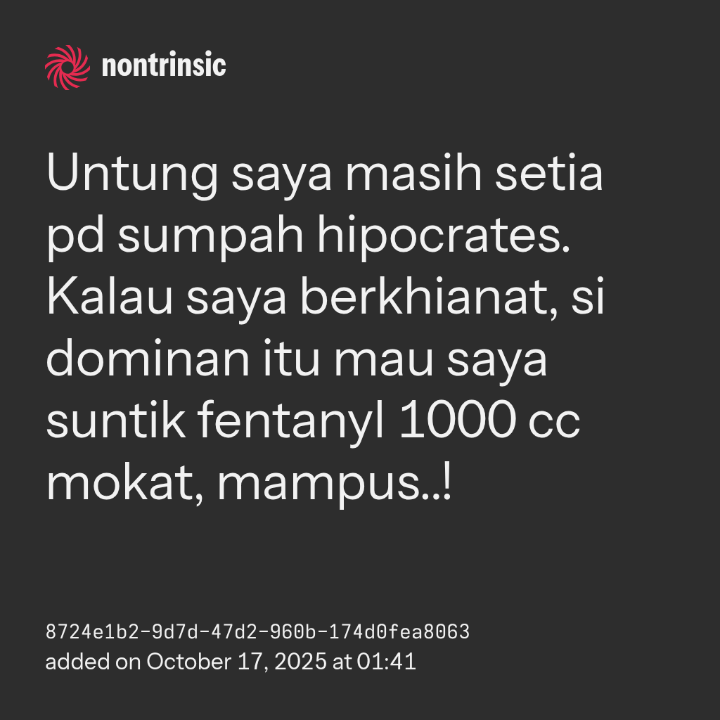 shareUntung saya masih setia pd sumpah hipocrates. Kalau saya berkhianat, si dominan itu mau saya suntik fentanyl 1000 cc mokat, mampus..!