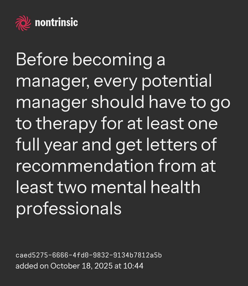Before becoming a manager, every potential manager should have to go to therapy for at least one full year and get letters of recommendation from at least two mental health professionals